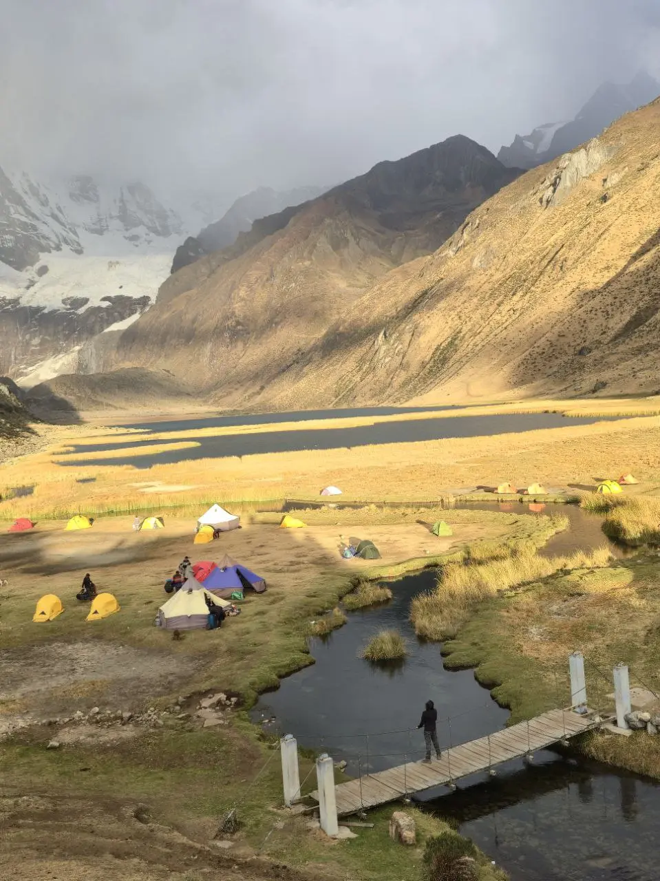 Desde campamento se sube un desnivel de 250 m. hasta paso Yaucha 4,800 msnm. del paso nos dirigiremos al mirador Huacrish 4,900m donde apreciaremos un panorama increíble de las lagunas de Jahuacocha y solteracocha, luego bajamos al campamento